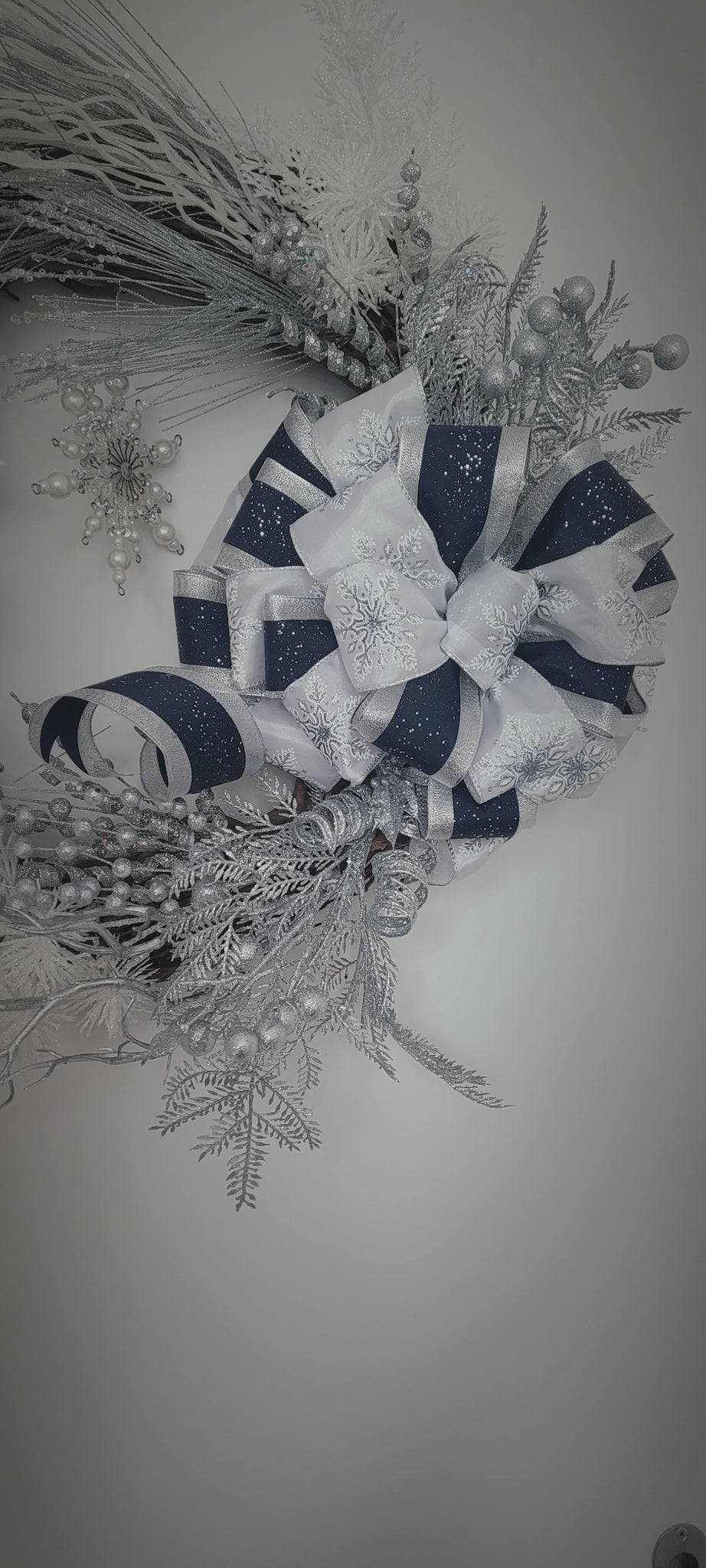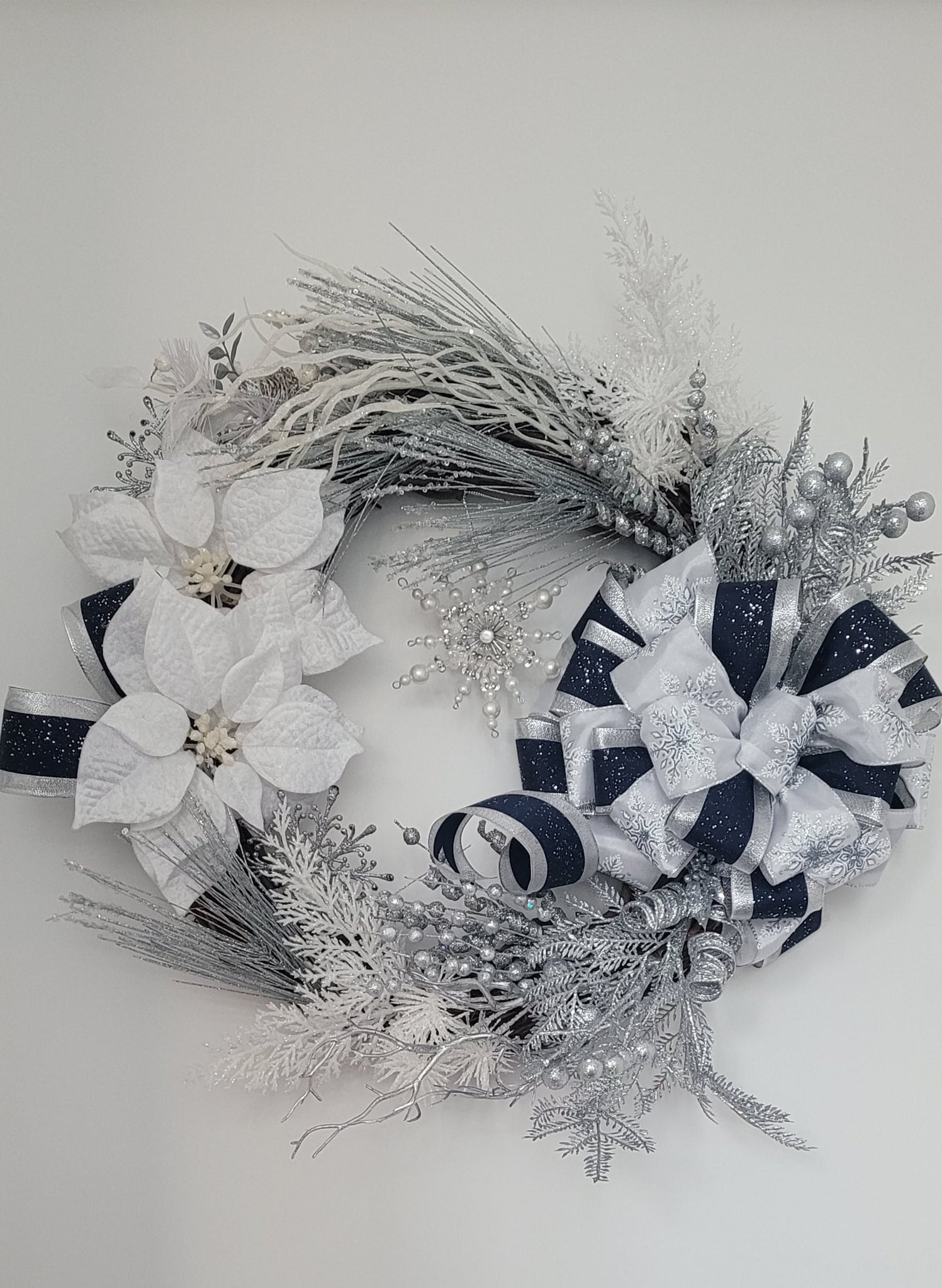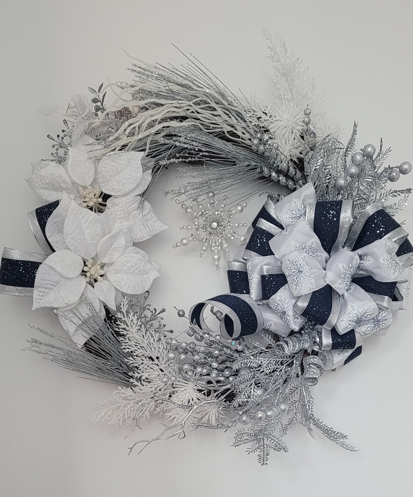 White poinsettias, ornaments, white/silver/blue fabric Christmas bow