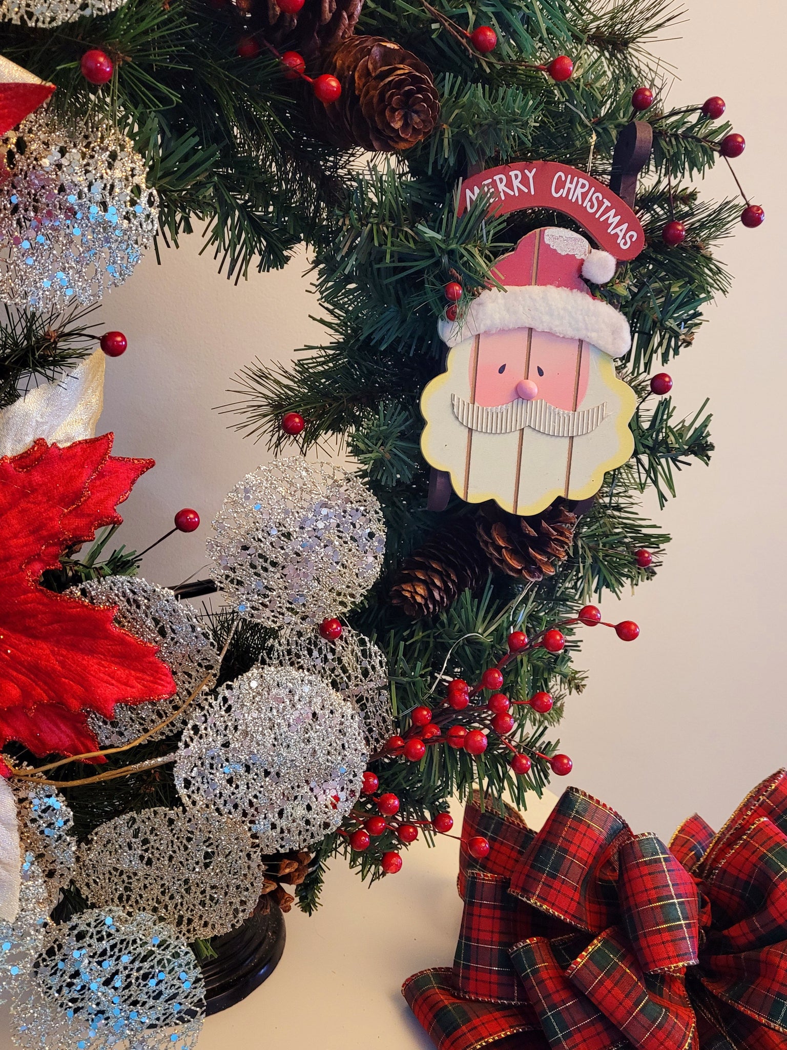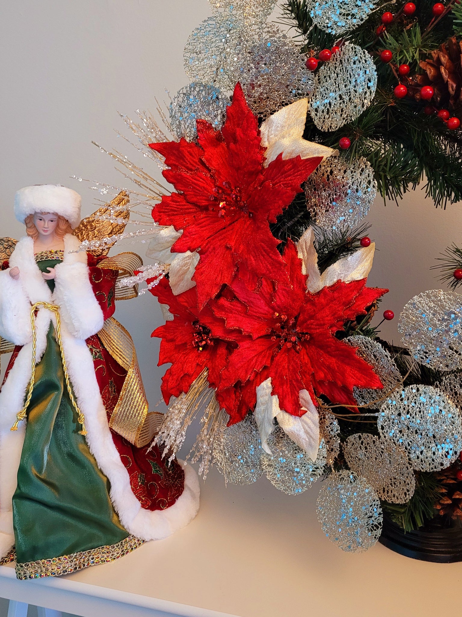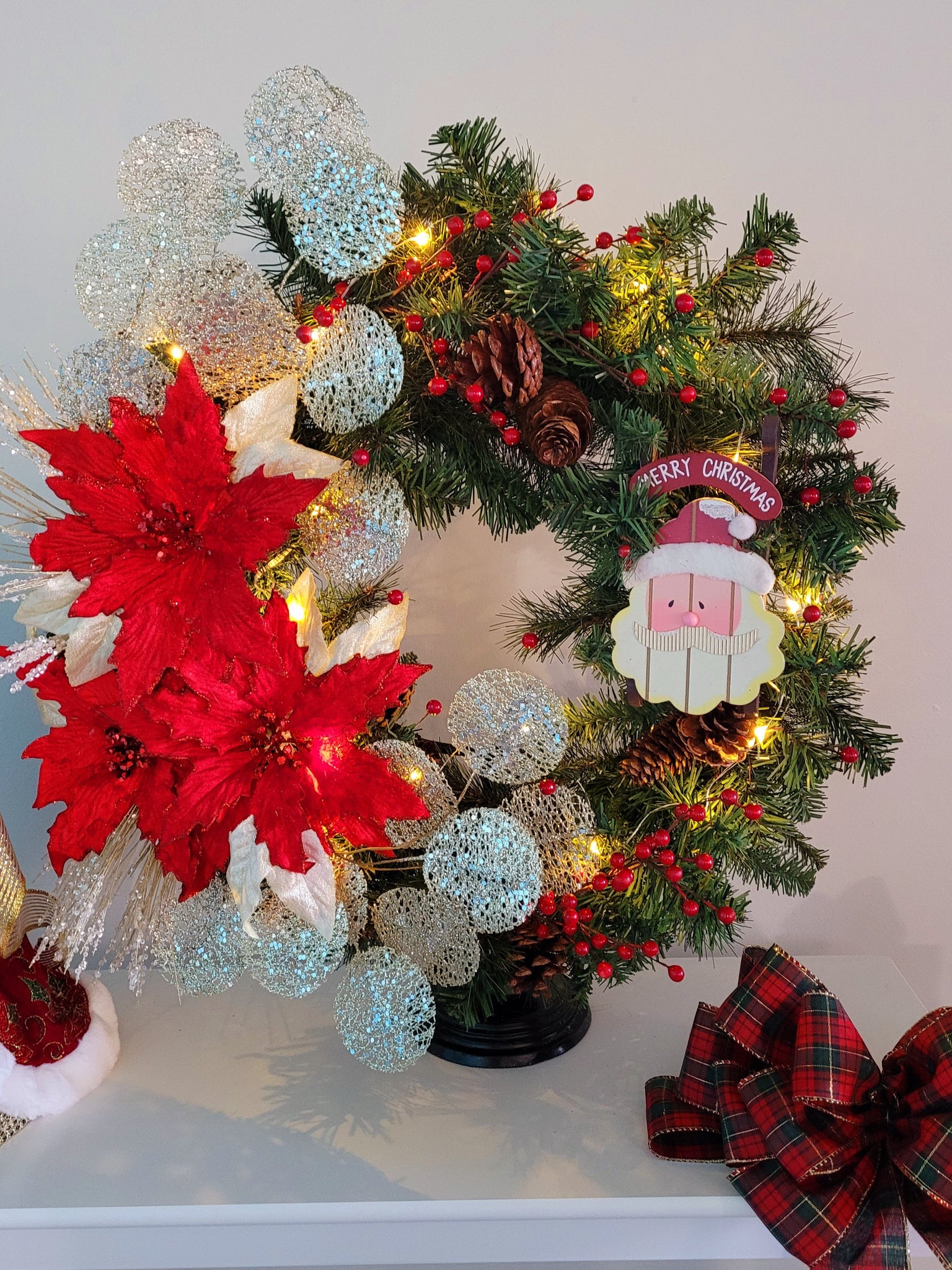 Easily one of my most colorful offerings, this handcrafted pre-lit faux poinsettia and pine wreath is a proverbial ring of festivity! Holiday colors simply explode from this wreath, filling the eyes with dazzling reds and greens. Ideal for times where you want to literally “fill” an area with holiday cheer, it also makes a fabulous gift. If you’d love something custom made in a colour or theme of your choice, please contact me directly and let’s make that happen.