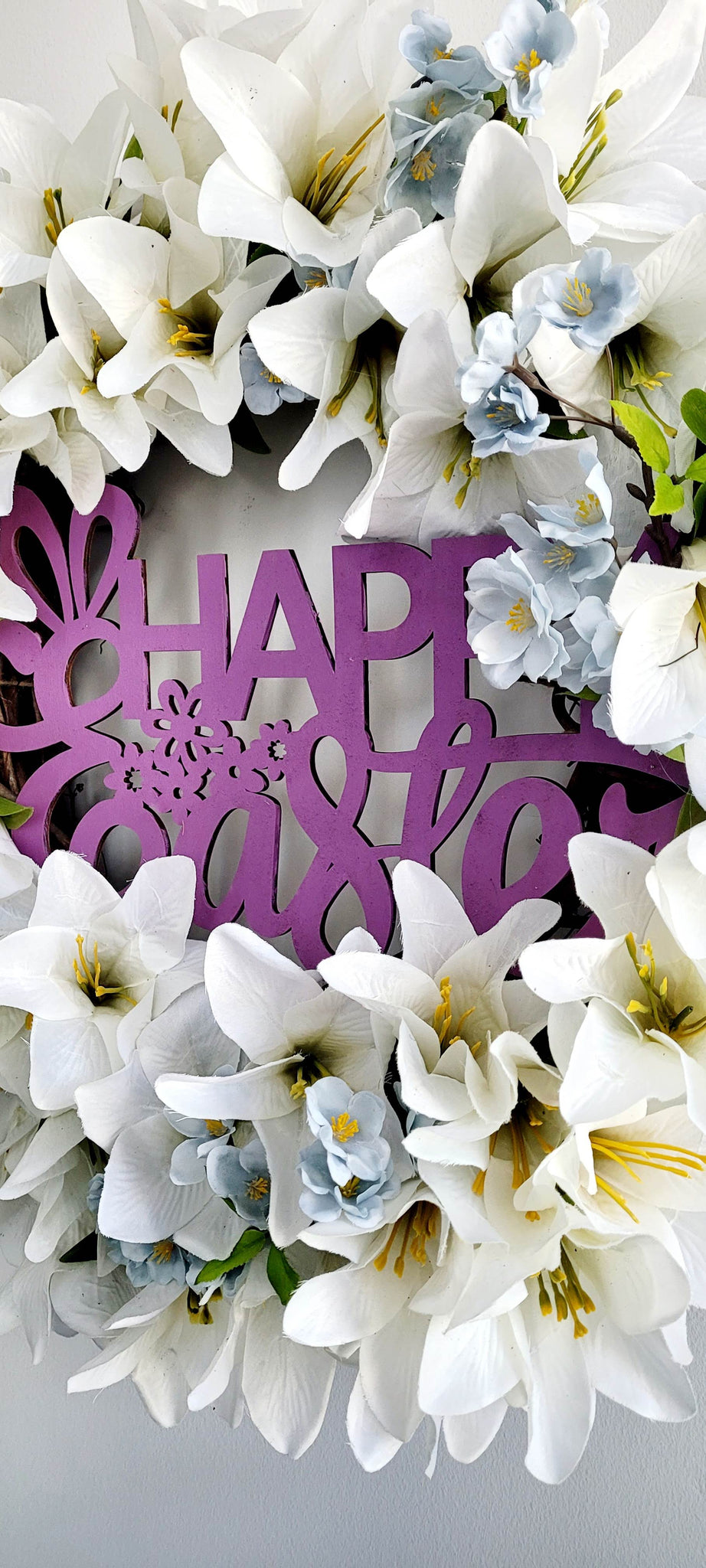 Faux white/creamish lillies with baby blue flowers